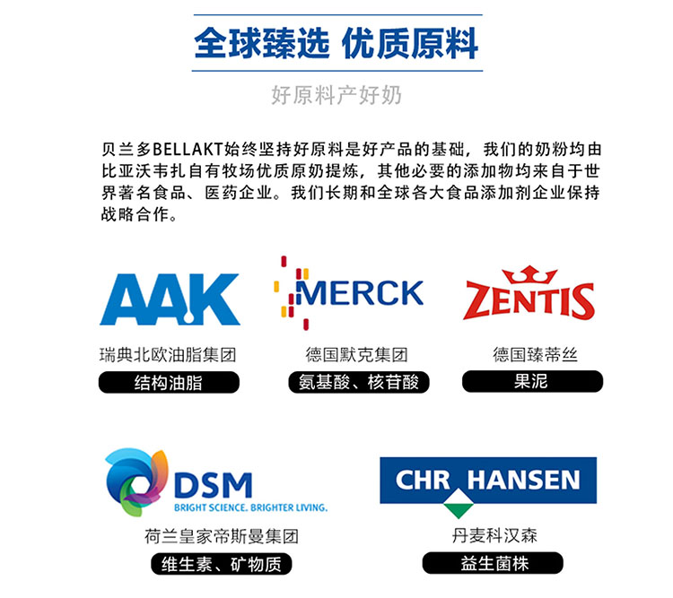貝蘭多始終堅持好原料是好產(chǎn)品的基礎(chǔ),奶粉均由比亞沃韋扎自有牧場優(yōu)質(zhì)奶源提煉,其他必要的添加物均來自于世界著名食品、醫(yī) 藥一夜。我們長期和全球各大食品添加劑企業(yè)保持戰(zhàn)略合作。