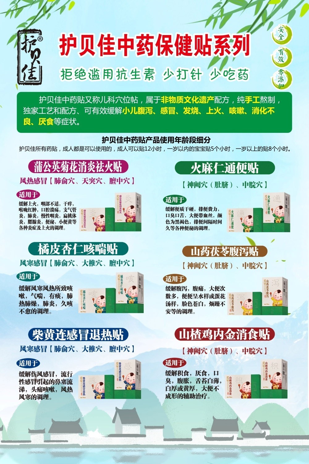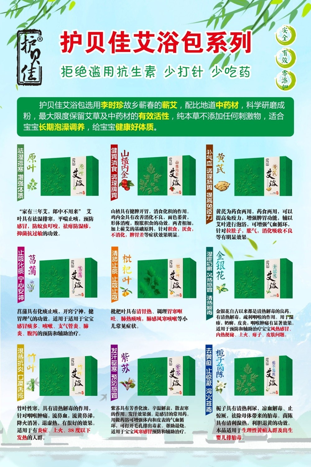 護(hù)貝佳貝愛——來自大自然的嬰幼兒健康護(hù)理品牌,以久負(fù)盛名的蘄艾和天然植物中草藥為原料,秉承“天然”、“安全”、“有效“、“零添加”的制造理念,倡導(dǎo)“少打針,少吃藥,杜絕抗生素”的健康理念,真正實(shí)現(xiàn)“健康育兒”的愿景,全面呵護(hù)寶寶的健康成長。