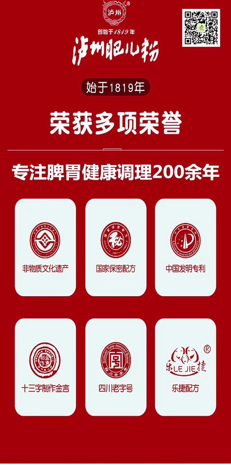 “瀘州肥兒粉”系有兩百年歷史傳承和六十年創(chuàng)牌與建廠史的嬰幼兒輔食及適合大眾養(yǎng)生和體弱多病中老年人食用的產(chǎn)品,我們獨(dú)特的“藥食同源配方”一度成為國(guó)家保密配方!盀o州肥兒粉”的前生誕生于1819年瀘州人蔣宗明在小市開辦的“瀘州米羹羹”作坊。直到新中國(guó)成立后,“瀘州米羹羹”作坊的傳承人何汝彬于1956年6月將“瀘州米羹羹”作坊與當(dāng)時(shí)的瀘州市副食品加工廠合并成立了 “瀘州市地方國(guó)營(yíng)北城肥兒粉廠”,陳雅南任廠長(zhǎng)至退休!盀o州肥兒粉”是以“肥兒丸”古方為基礎(chǔ),主料為糙米,配料選用能健脾益胃、消食助運(yùn)的大豆、綠豆、苡仁、芡實(shí)、建神曲等7-21種藥食同源級(jí)食材經(jīng)過“炒、燒、烤、燜、烘、焙,磨、蒸、煮、炙、碾、沙、土”等十三道手工工藝制作,發(fā)明創(chuàng)造的我國(guó)首例嬰幼兒藥理配方米粉。1956年夏,產(chǎn)品基本定型,并以“瀘州”二字設(shè)計(jì)制作了品牌標(biāo)記,第一代“瀘州肥兒粉”正式誕生。1960年4月3日成功注冊(cè)“肥兒粉”商標(biāo);又于1979年10月31日獲準(zhǔn)以“瀘州”為商標(biāo)使用,從此“瀘州肥兒粉”擁有了雙商標(biāo)。1988年,“瀘州肥  兒粉”被瀘州市醫(yī)藥管理局正式確定為保健食品;1993年“瀘州肥兒粉”獲得蒙古國(guó)烏蘭巴托國(guó)際食品博覽會(huì)金獎(jiǎng)。