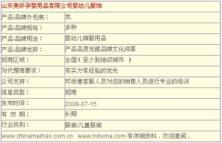 品牌名稱:美好小棉襖 主營產(chǎn)品:美好小棉襖誠邀加盟 品牌特色:溫馨 健康