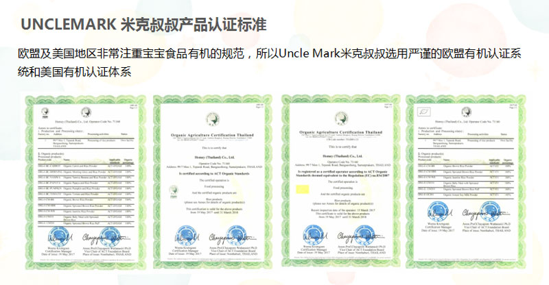 3.吃進肚子里的必須是安全的,米克叔叔產(chǎn)品已通過歐盟有機認證、美國有機認證、質(zhì)量管理體系認證、國際食品安全認證、優(yōu)良制造標準認證等相關國際認證。