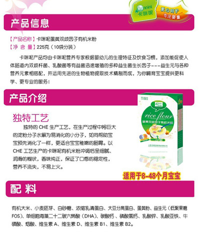 卡咪呢有機米粉系列是專為中國寶寶設(shè)計的營養(yǎng)輔食,選用有機大米,科學搭配維生素AD等維生素,還特別添加;撬帷HA、AA等有助智力發(fā)育的營養(yǎng)成分,富含15種營養(yǎng)素,F(xiàn)上?ㄟ淠啬笅胗闷酚邢薰久嫦蛉珖瞻资袌鰠^(qū)域誠招卡咪呢有機米粉代理商。