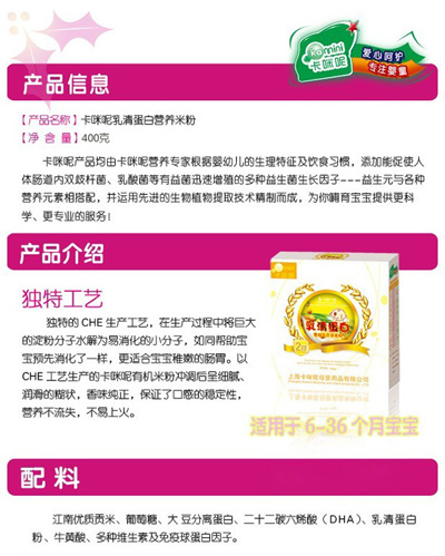 卡咪呢乳清蛋白嬰幼兒營養(yǎng)米粉是上海卡咪呢母嬰用品有限公司旗下產品,精選優(yōu)質大米制作,特別添加乳清蛋白和益生元,提高寶寶抵抗力,促進寶寶changdao的消化吸收,上市以來廣受父母消費者的青睞。
