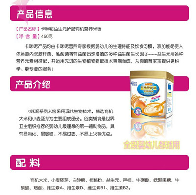 卡咪呢有機(jī)米粉系列是專為中國寶寶設(shè)計(jì)的營養(yǎng)輔食,選用有機(jī)大米,科學(xué)搭配維生素AD等維生素,還特別添加;撬帷HA、AA等有助智力發(fā)育的營養(yǎng)成分,富含15種營養(yǎng)素,F(xiàn)上海卡咪呢母嬰用品有限公司面向全國空白市場區(qū)域誠招卡咪呢有機(jī)米粉代理商。