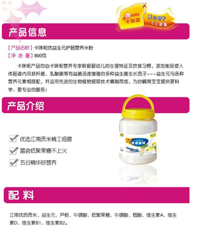 卡咪呢有機(jī)米粉系列是專為中國(guó)寶寶設(shè)計(jì)的營(yíng)養(yǎng)輔食,選用有機(jī)大米,科學(xué)搭配維生素AD等維生素,還特別添加;撬帷HA、AA等有助智力發(fā)育的營(yíng)養(yǎng)成分,富含15種營(yíng)養(yǎng)素,F(xiàn)上?ㄟ淠啬笅胗闷酚邢薰久嫦蛉珖(guó)空白市場(chǎng)區(qū)域誠(chéng)招卡咪呢有機(jī)米粉代理商。