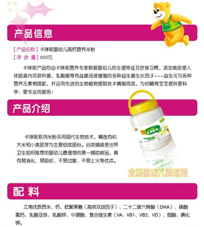 卡咪呢乳清蛋白嬰幼兒營養(yǎng)米粉是上?ㄟ淠啬笅胗闷酚邢薰酒煜庐a(chǎn)品,精選優(yōu)質(zhì)大米制作,特別添加乳清蛋白和益生元,提高寶寶抵抗力,促進(jìn)寶寶changdao的消化吸收,上市以來廣受父母消費者的青睞。