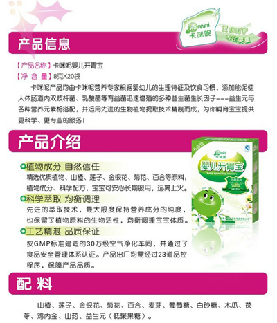 卡咪呢小兒板藍(lán)根顆粒是上?ㄟ淠啬笅胗闷酚邢薰酒煜庐a(chǎn)品,專為嬰幼兒設(shè)計,專業(yè)、安全,幫助寶寶可以預(yù)防感冒抵抗病毒,是廣大父母育兒的好幫手。卡咪呢小兒板藍(lán)根顆粒不含任何色素、防腐劑,安全放心。