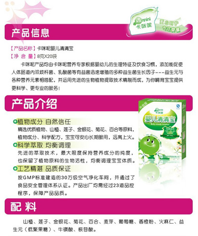 卡咪呢小兒板藍根顆粒是上?ㄟ淠啬笅胗闷酚邢薰酒煜庐a(chǎn)品,專為嬰幼兒設(shè)計,專業(yè)、安全,幫助寶寶可以預(yù)防感冒抵抗病毒,是廣大父母育兒的好幫手?ㄟ淠匦喊逅{根顆粒不含任何色素、防腐劑,安全放心。