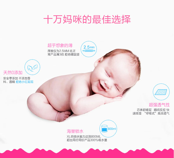360°彈力貼身腰圍,超柔、超舒適。超柔3D打孔大珍珠面層,有效減少皮膚接觸,清新干爽,呵護(hù)寶寶小屁屁。干爽升級(jí),雙層舒爽芯,進(jìn)口住友+三大雅高分子完美配比,瞬間吸收、牢固鎖水。熱風(fēng)新微孔高效排氣底膜,及時(shí)排除悶熱濕氣。 遇濕變色魔幻尿顯,及時(shí)發(fā)現(xiàn)寶寶的小秘密。自動(dòng)外翻立體防側(cè)漏隔邊,防止側(cè)漏,寶媽更放心。根據(jù)中國寶寶體型設(shè)計(jì),貼合臀部曲線,伸展自如。