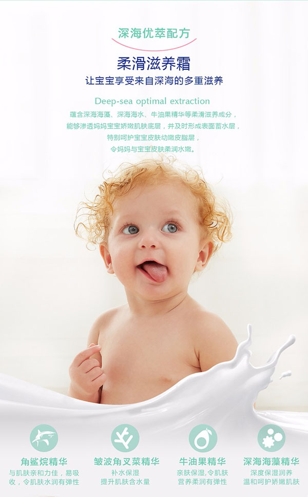 貝施康柔滑滋養(yǎng)霜是 “深海優(yōu)萃”系列的滋養(yǎng)產(chǎn)品,根據(jù)嬰兒特殊肌膚PH特點(diǎn)研制,從深海中萃取自然純凈成分,配方做到純正安全,讓媽媽心安!