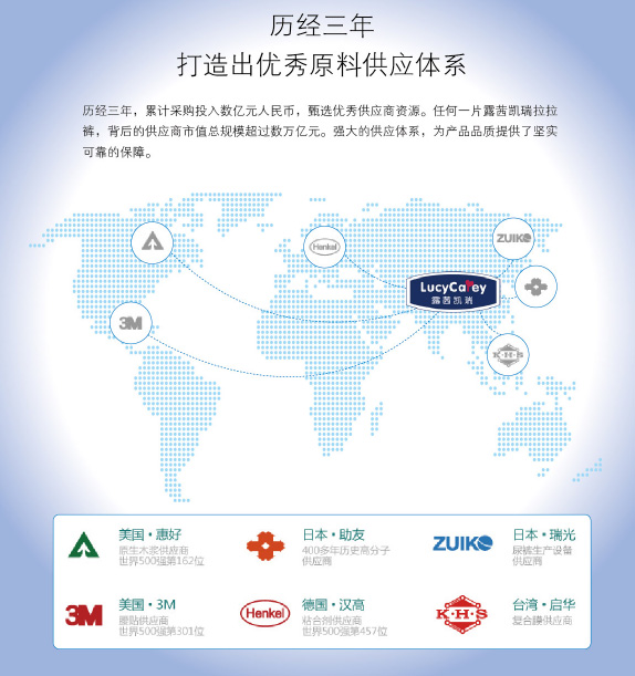 LUCYCAREY露茜凱瑞成長(zhǎng)褲選用全球頂尖供應(yīng)商的紙尿褲原材料:住友、三大雅高分子吸水材料;美國(guó)3M魔術(shù)貼;德國(guó)萊卡松緊帶;美國(guó)進(jìn)口原生木漿;德國(guó)漢高粘合劑;美國(guó)、日本進(jìn)口無(wú)紡布;進(jìn)口超柔軟透氣底膜等。另外,全世界zui先進(jìn)的全自動(dòng)紙尿褲生產(chǎn)線,年產(chǎn)銷數(shù)億片紙尿褲的成熟的生產(chǎn)制造團(tuán)隊(duì),確保產(chǎn)品高品質(zhì)。