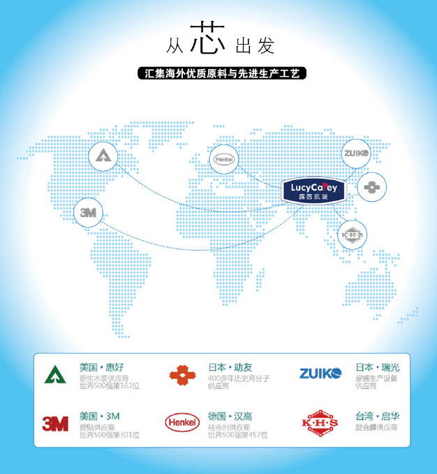 LUCYCAREY露茜凱瑞紙尿褲選用全球頂尖供應(yīng)商的紙尿褲原材料:住友、三大雅高分子吸水材料;美國3M魔術(shù)貼;德國萊卡松緊帶;美國進(jìn)口原生木漿;德國漢高粘合劑;美國、日本進(jìn)口無紡布;進(jìn)口超柔軟透氣底膜等。另外,全世界zui先進(jìn)的全自動(dòng)紙尿褲生產(chǎn)線,年產(chǎn)銷數(shù)億片紙尿褲的成熟的生產(chǎn)制造團(tuán)隊(duì),確保產(chǎn)品高品質(zhì)。