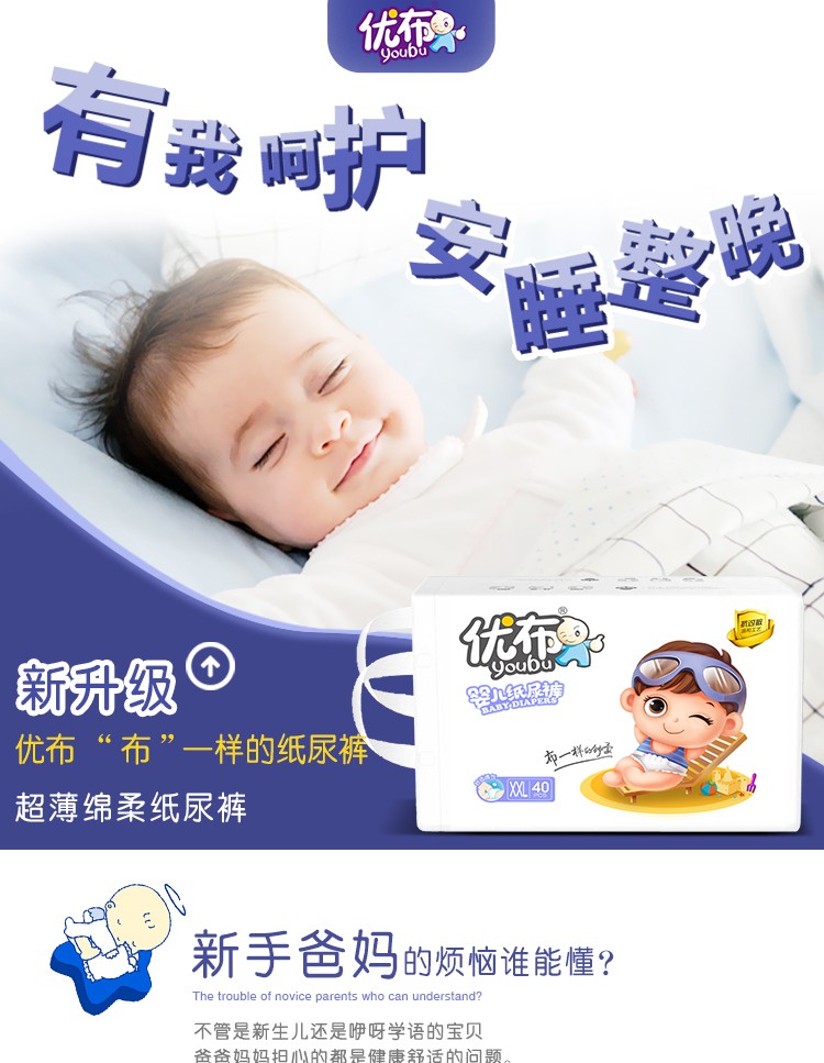 優(yōu)布隸屬優(yōu)布時(shí)代生活用品(湖南)有限公司旗下品牌,這款優(yōu)布嬰兒紙尿褲傾心選材,將優(yōu)秀品質(zhì)集于一身,深受寶媽的信賴,用心為寶寶帶來更舒適守護(hù),全“芯”呵護(hù),持久干爽,遠(yuǎn)離紅屁屁煩惱!