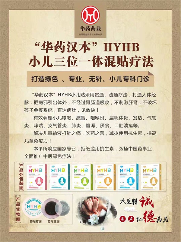 “華藥漢本”HYHB小兒貼采用貫通、疏通療法,打通人體經(jīng)脈,把病邪引出體外,不經(jīng)過(guò)胃腸道吸收,不刺激肝腎,不破壞孩子免疫系統(tǒng),直達(dá)病灶。安全調(diào)理小兒咳嗽、感冒、咽喉炎、扁桃體炎、發(fā)熱、氣管炎、哮踹、支氣管炎、肺炎、腹瀉、厭食、口腔潰瘍等。避免兒童輸液打針之痛,吃藥之苦,減少使用抗生素。