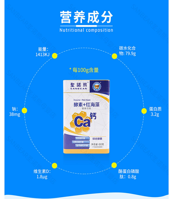 主要成分:葡萄糖、紅海藻粉、豆?jié){粉、碳酸鈣、維生素D3、綜合酵素(木瓜酵素、菠蘿酵素、奇異果酵素)1%、酪蛋白磷酸肽4%、鼠李糖乳桿菌、乳雙歧桿菌、動物雙歧桿菌、(每袋添加300毫克紅海藻粉)