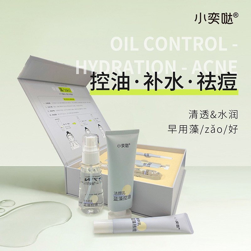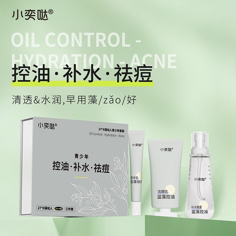 小奕噠青少年藍(lán)藻控油補(bǔ)水祛痘三件套,包含:藍(lán)藻控油潔顏乳+藍(lán)藻控油補(bǔ)水噴霧+藍(lán)藻祛痘精華乳,控油、補(bǔ)水、祛痘,清透水潤(rùn)。