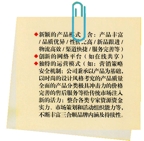 2007 年,三合順制定新時期發(fā)展戰(zhàn)略,以“童悅”作為公司自有主打品牌,秉承“一切為了孩子”這一核心理念,橫跨自行車和兒童用品兩大行業(yè),專業(yè)從事系列化兒童用品創(chuàng)新研發(fā)、組織生產(chǎn)、外貿(mào)內(nèi)銷和文化服務(wù),建立覆蓋“供—產(chǎn)—儲—運—展—銷—交—服”供應(yīng)鏈系統(tǒng)解決方案的強勢品牌。同時,三合順與北京中卡世紀動漫文化傳媒有限公司達成戰(zhàn)略合作,制作品牌動畫片,全程助力“童悅”品牌形象的創(chuàng)建和推廣。