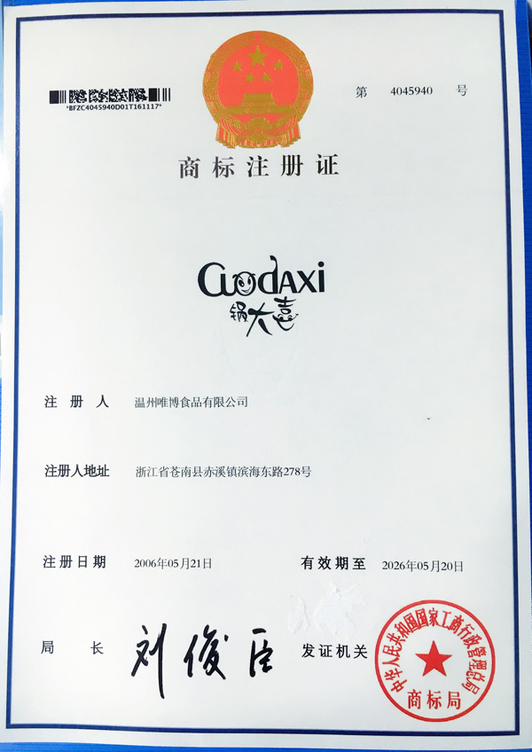 鍋大喜是溫州唯博食品有限公司旗下品牌,公司創(chuàng)辦于2012年,座落于享有“紫菜之鄉(xiāng)”美譽(yù)的蒼南縣赤溪鎮(zhèn),占地面積5000多平方米,建筑面積3000多平方米,現(xiàn)擁有員工95人,其中專業(yè)技術(shù)人員28人。目前擁有大型淡水紫菜養(yǎng)殖生產(chǎn)基地800畝,是一家集海產(chǎn)品養(yǎng)殖、加工、銷售一條龍的企業(yè),主導(dǎo)的產(chǎn)品有韓式香酥海苔、芝麻夾心海苔、海苔卷、壽司海苔、紫菜湯等產(chǎn)品。