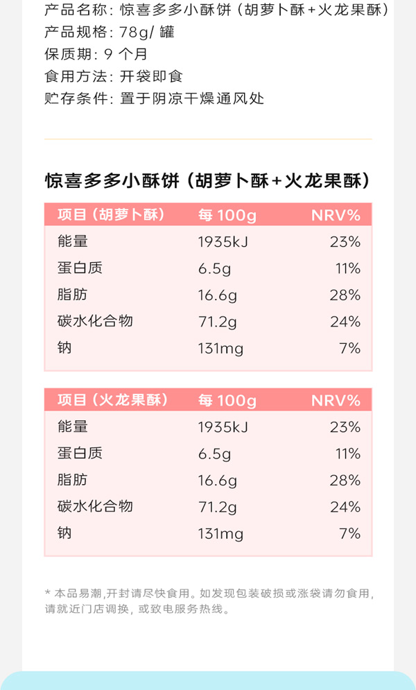 藍(lán)貝多多驚喜多多小酥餅(胡蘿卜酥+火龍果酥)添加胡蘿卜&火龍果,拒絕多余添加,雙拼口味,雙重滿(mǎn)足,低溫烘焙, 非油炸,保留食材中的營(yíng)養(yǎng)成分,鎖住食材色香味,海藻糖更益牙,不會(huì)引起齲齒,獨(dú)立小包,定時(shí)定量。