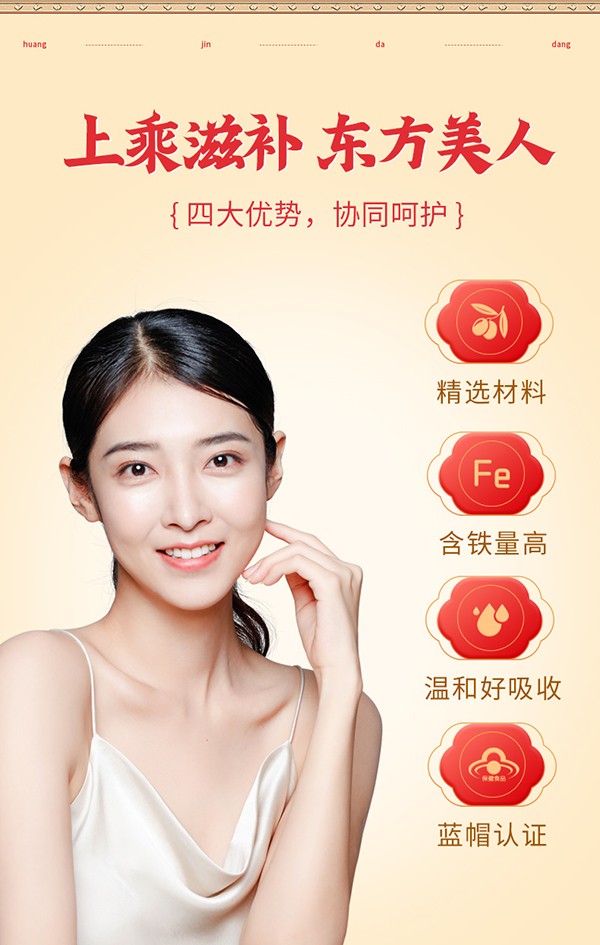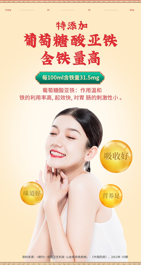 黃金搭檔枸杞烏雞阿膠口服液,藍(lán)帽保健食品,為缺鐵性貧血者精心研制!專注補(bǔ)鐵補(bǔ)血,名副其實(shí)的“血黃金”!精選優(yōu)質(zhì)食材配以藥食兩用原料,如烏雞、枸杞子、大棗、阿膠以及葡萄糖酸亞鐵等等,同時(shí)添加多種微量元素,營養(yǎng)成分含量更高,更均衡!每100ml含鐵31.5mg,含粗多糖61mg,上乘滋補(bǔ),溫和好吸收,喚醒好氣色!