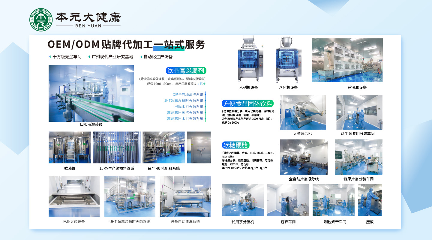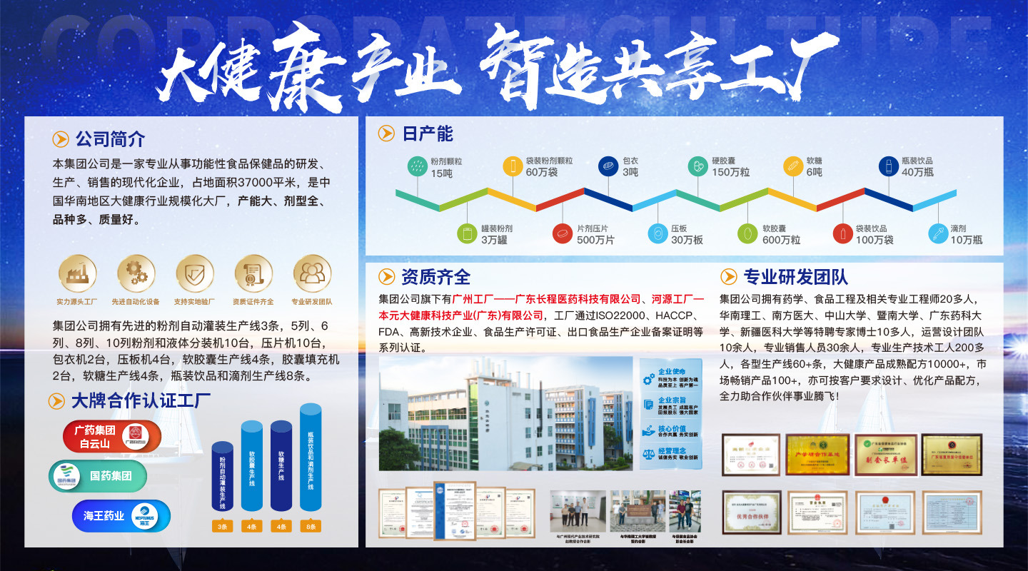 本元大健康集團公司是一家專業(yè)從事功能性食品保健品的研發(fā)、生產(chǎn)、銷售的現(xiàn)代化企業(yè),旗下有廣州工廠--廣東長程醫(yī)藥生物科技有限公司和河源工廠--本元大健康科技產(chǎn)業(yè)(廣東)有限公司,總占地面積37000平米,是中國華南地區(qū)大健康行業(yè)規(guī);髲S,產(chǎn)能大、劑型全、品種多、質(zhì)量好。