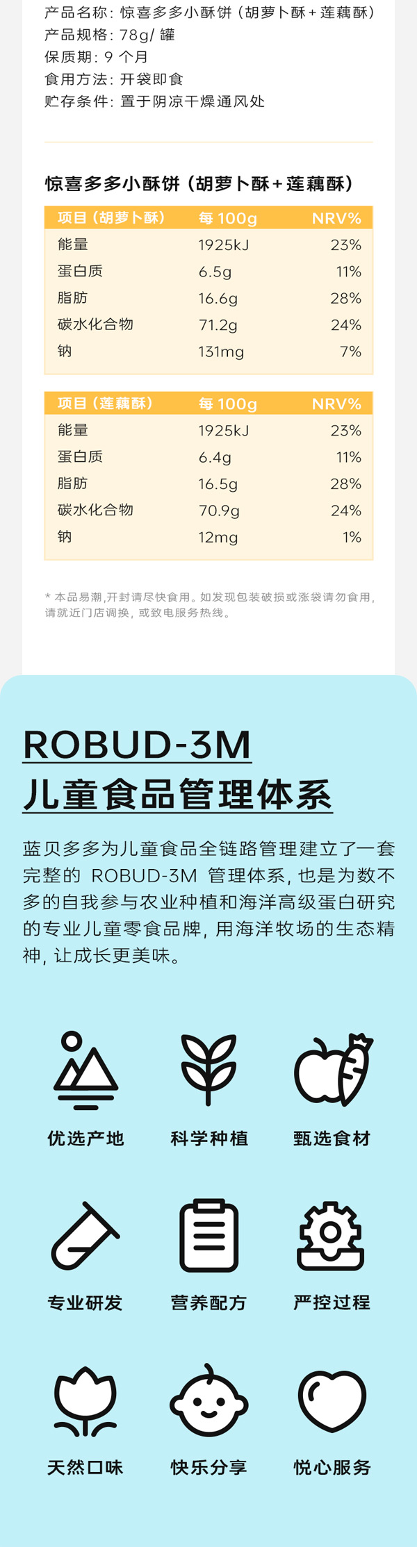 藍(lán)貝多多驚喜多多小酥餅(胡蘿卜酥+蓮藕酥),添加蓮藕&胡蘿卜,拒絕多余添加,雙拼口味,雙重滿足,低溫烘焙, 非油炸,保留食材中的營養(yǎng)成分,鎖住食材色香味,海藻糖更益牙,不會引起齲齒,獨(dú)立小包,定時(shí)定量。