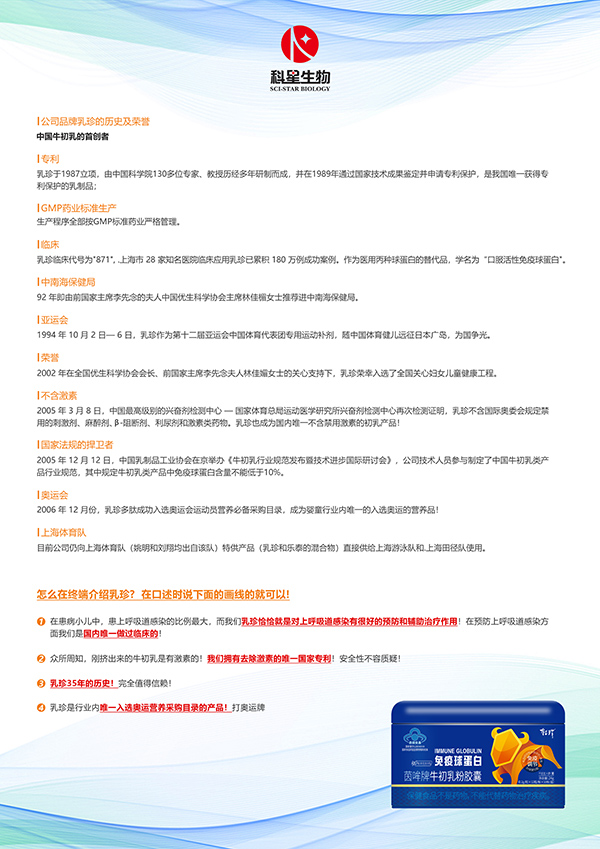 中科乳珍,中國科學(xué)院生命科學(xué)研究院研制,35年有效臨床經(jīng)驗(yàn)!民族品牌,藍(lán)帽品質(zhì)!每粒含免疫球蛋白36mg,遠(yuǎn)高于市場上的同類產(chǎn)品,特采用ASP活性物質(zhì)保鮮技術(shù),為免疫力低下人群精心研發(fā)設(shè)計(jì)!嬰幼兒、兒童、成人均可食用,經(jīng)動物及功能實(shí)驗(yàn)評價(jià),具有免疫調(diào)節(jié)的保健功能!