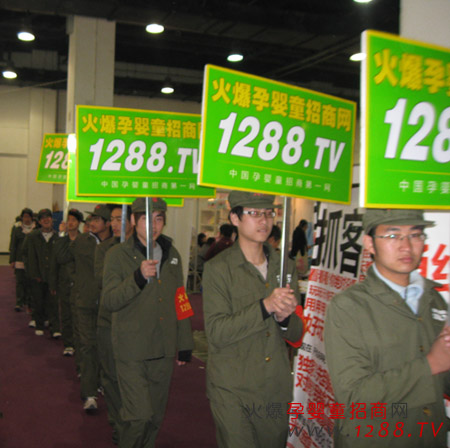 我們火爆孕嬰童穿上我們標志性服裝,身穿紅衛(wèi)兵綠色軍裝,頭戴火爆字樣綠色軍帽,左臂佩戴紅色火爆字樣袖章,高舉火爆孕嬰童招商網,1288.tv字樣的宣傳牌吸引了所有參展人員的目光。